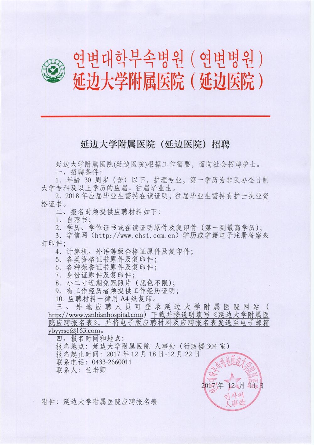 2017年延边大学附属医院(延边医院)招聘护士启事
