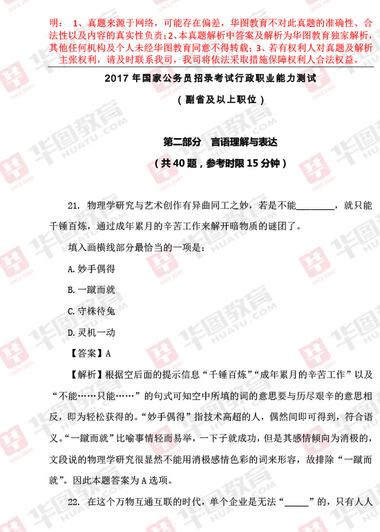 2017年国家公务员考试行测试题答案之言语理解(省部级)