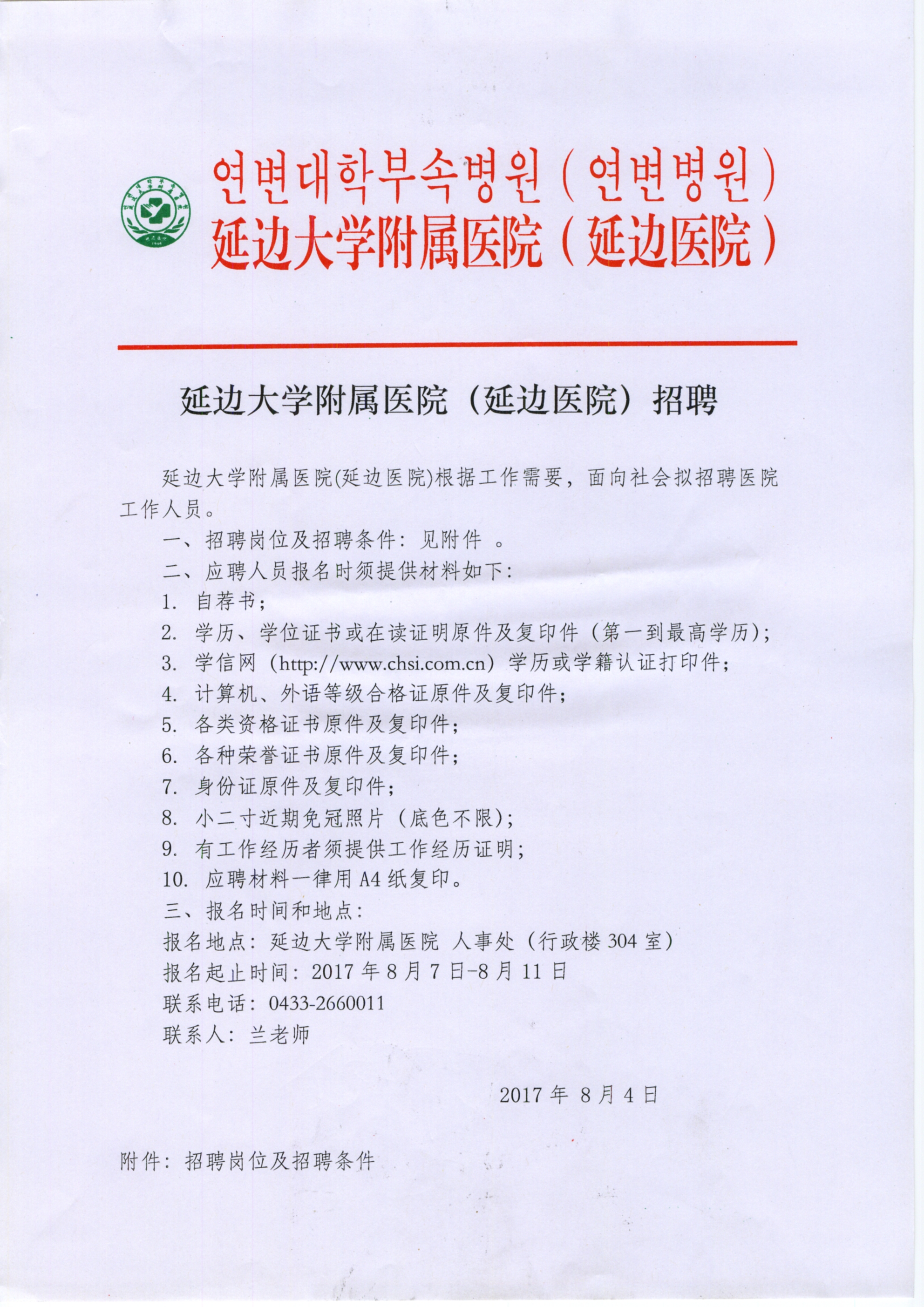 2017年延边大学附属医院(延边医院)招聘通知