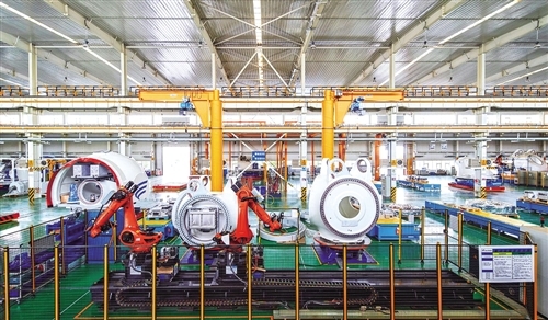 新疆金风科技股份有限公司位于新疆哈密的总装智能生产线,该生产线比传统生产线更省人力、误差更小、效率更高。 新华社发